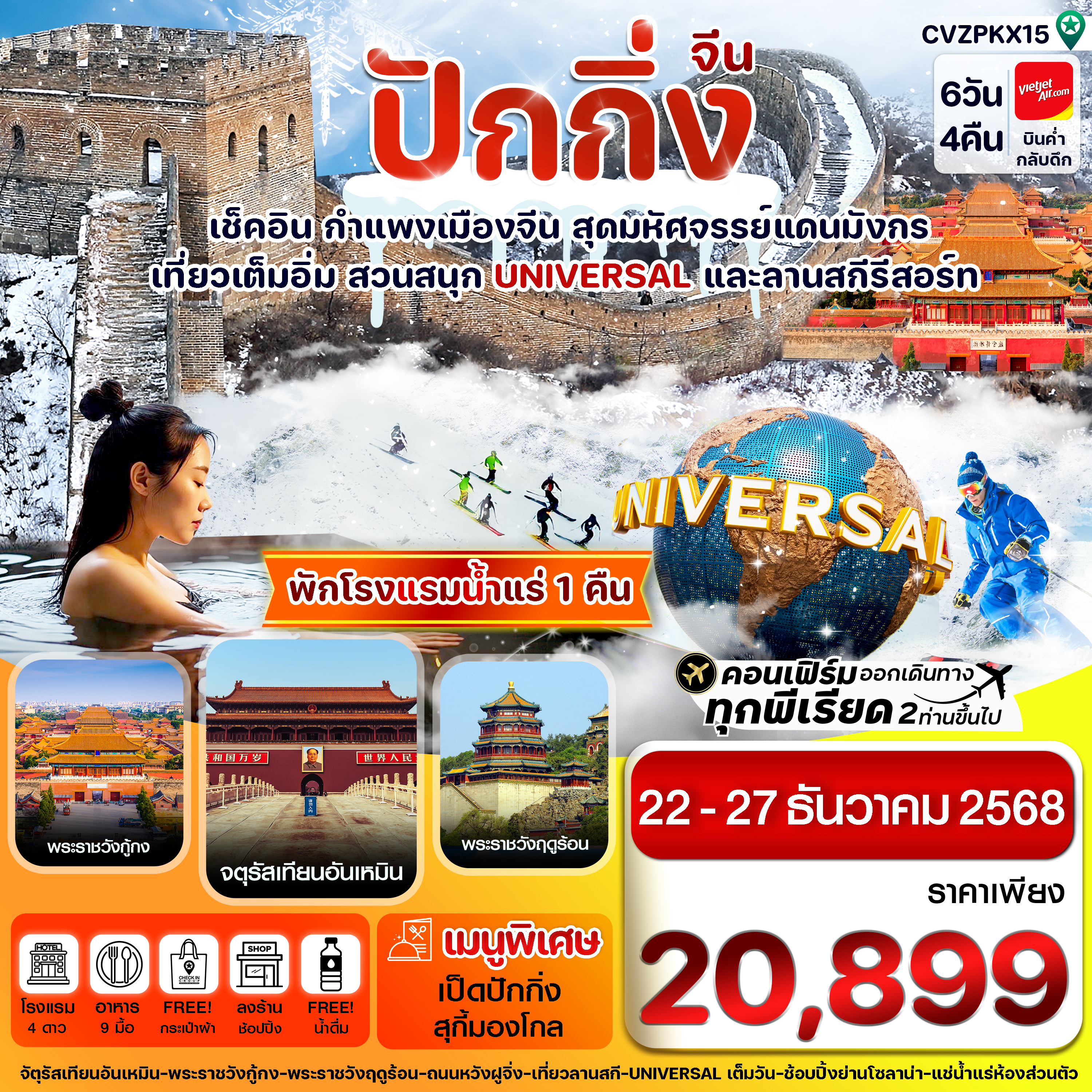 CVZPKX17 ปักกิ่ง -สวนสนุก UNIVERSAL-กำแพงเมืองจีน ลานสกีรีสอร์ต 6วัน4คืน 24-29Dec 25 (ทัวร์ลงร้าน)
