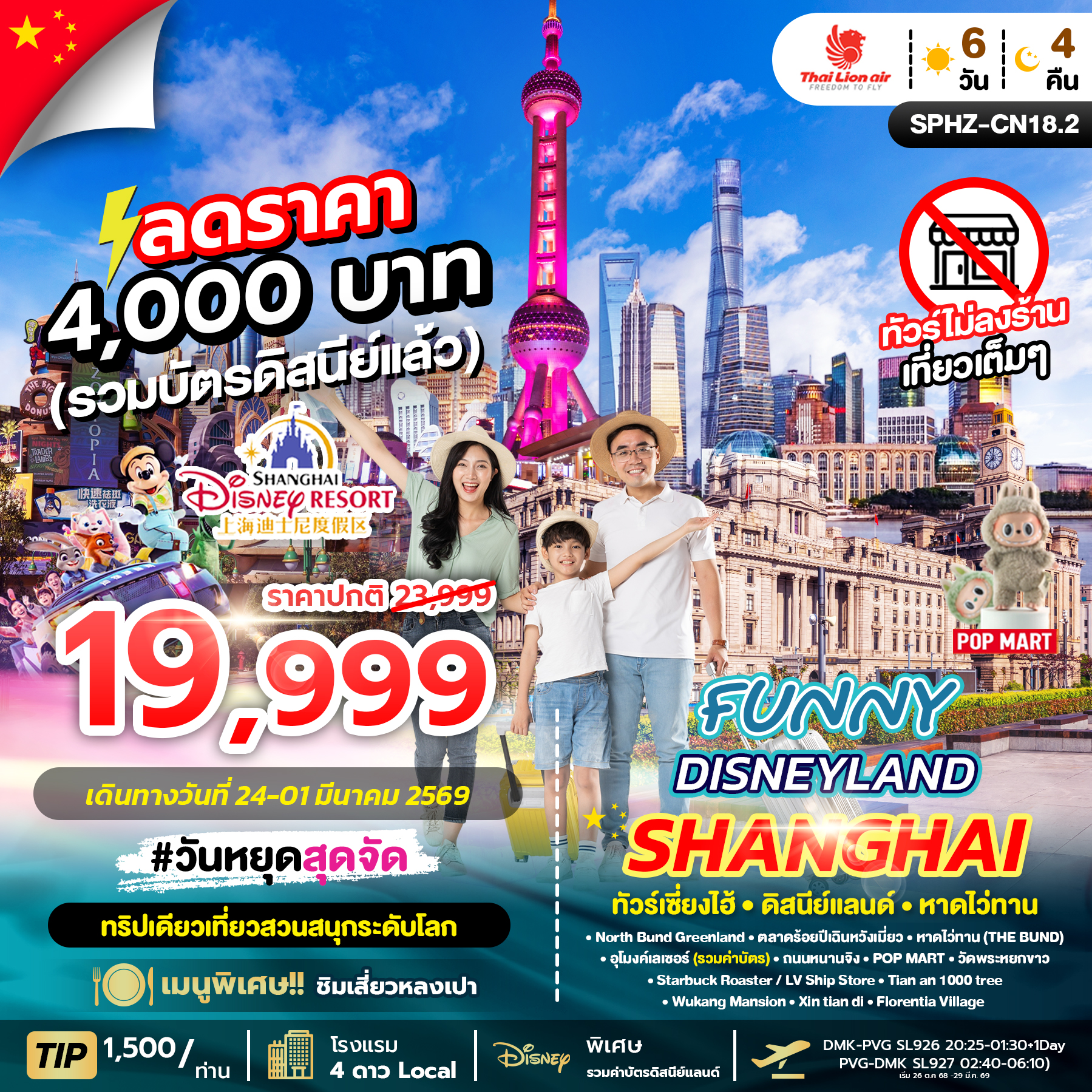 SPHZ-CN18.2 FUNNY DISNEYLAND 6D4N (SL) รวมดิสนีย์+มีฟรีเดย์ 1 วัน +ไม่ลงร้าน